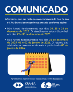 SERVIÇOS - FORMULÁRIOS REGISTRO - PESSOA FÍSICA REGISTRO - PESSOA JURÍDICA SERVIÇOS ONLINE ÚLTIMAS NOTÍCIAS REVISTA DOS PROFISSIONAIS DE ADMINISTRAÇÃO Confira outras publicações ÚLTIMAS NOTÍCIAS FISCALIZAÇÃO EM FOCO CLUBE DE VANTAGENS DESTAQUES DO CRA-BA Fiscalização CRA-BA ...Leia Mais CFA Talentos ...Leia Mais Universidade Corporativa do Administrador – UCAdm Acesse aqui o site da UCAdm O CRA-BA, em parceria com o CRA-RJ, disponibiliza para os Administradores e Tecnólogos a ...Leia Mais Edital de Chamamento Público para Credenciamento de Pessoas Jurídicas no CRA-BA O Presidente do Conselho Regional de Administração da Bahia (CRA-BA), no uso das suas atribuições legais regimentais e de conformidade ...Leia Mais CRA-SP Educa – Cursos Online Gratuitos Por meio de parcerias firmadas com algumas das mais importantes e representativas Instituições de Ensino do Brasil e do exterior, ...Leia Mais Planos de Saúde Qualicorp (Sulamérica - Ampla Saúde - Atitude Saúde - Hapvida)Diego Sá - Consultor Parceiro(71) 4141-7893(71) 98122-6663E-mail: contato@cotacoesplanosdesaude.adm.brAffix Benefícios(Amil Saúde)Atendimento virtual: (11) ...Leia Mais