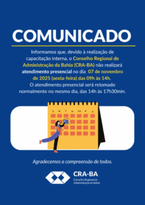 SERVIÇOS - FORMULÁRIOS REGISTRO - PESSOA FÍSICA REGISTRO - PESSOA JURÍDICA SERVIÇOS ONLINE ÚLTIMAS NOTÍCIAS REVISTA DOS PROFISSIONAIS DE ADMINISTRAÇÃO Confira outras publicações ÚLTIMAS NOTÍCIAS FISCALIZAÇÃO EM FOCO CLUBE DE VANTAGENS DESTAQUES DO CRA-BA Fiscalização CRA-BA ...Leia Mais CFA Talentos ...Leia Mais Universidade Corporativa do Administrador – UCAdm Acesse aqui o site da UCAdm O CRA-BA, em parceria com o CRA-RJ, disponibiliza para os Administradores e Tecnólogos a ...Leia Mais Edital de Chamamento Público para Credenciamento de Pessoas Jurídicas no CRA-BA O Presidente do Conselho Regional de Administração da Bahia (CRA-BA), no uso das suas atribuições legais regimentais e de conformidade ...Leia Mais CRA-SP Educa – Cursos Online Gratuitos Por meio de parcerias firmadas com algumas das mais importantes e representativas Instituições de Ensino do Brasil e do exterior, ...Leia Mais Planos de Saúde Qualicorp (Sulamérica - Ampla Saúde - Atitude Saúde - Hapvida)Diego Sá - Consultor Parceiro(71) 4141-7893(71) 98122-6663E-mail: contato@cotacoesplanosdesaude.adm.brAffix Benefícios(Amil Saúde)Atendimento virtual: (11) ...Leia Mais
