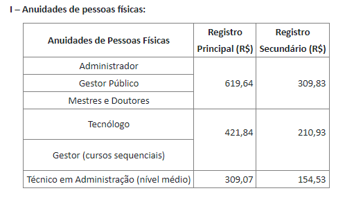 * O Bacharel em Áreas de Administração que se registrar a partir do mês de fevereiro pagará a anuidade em sua forma proporcional.